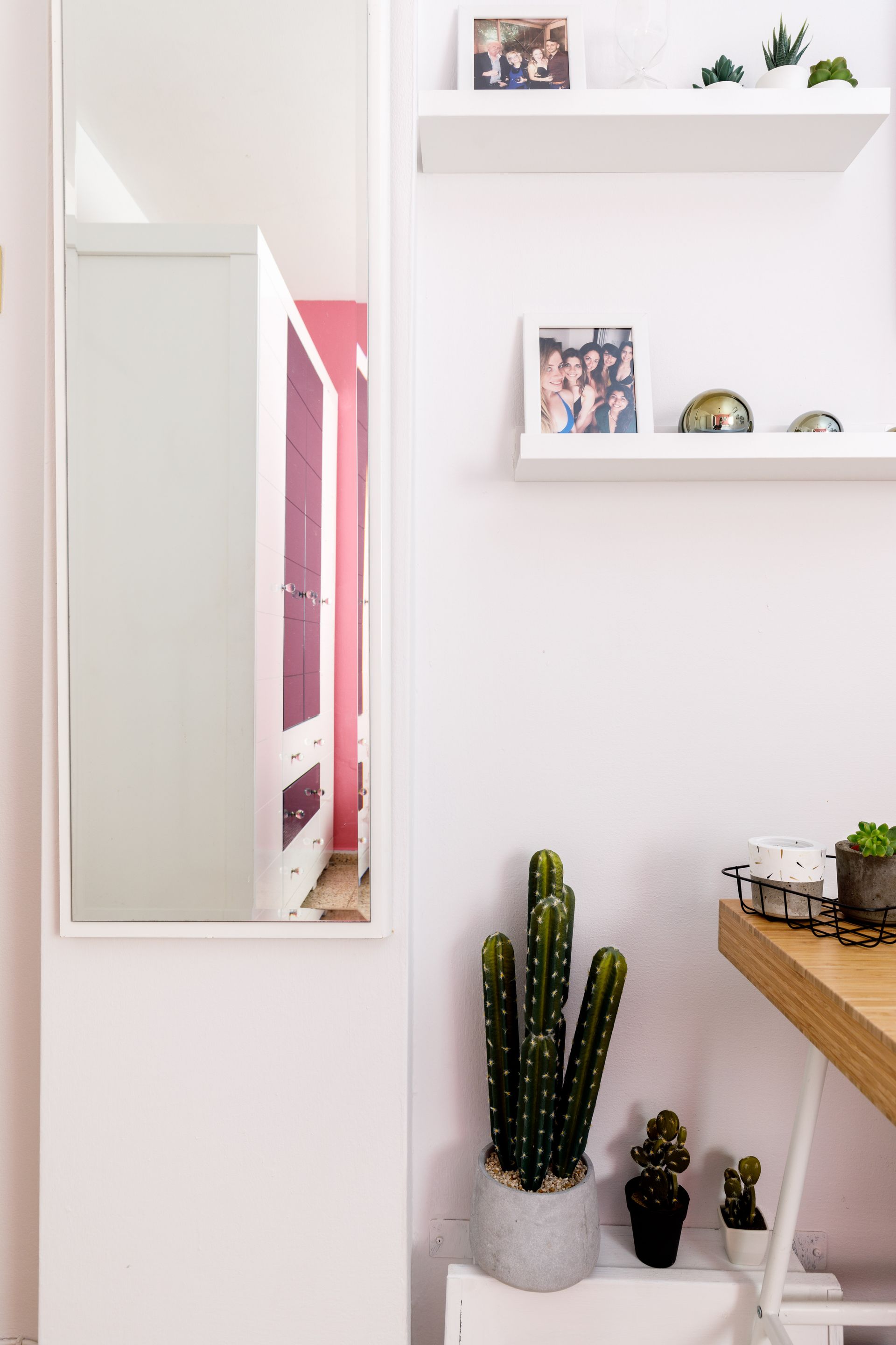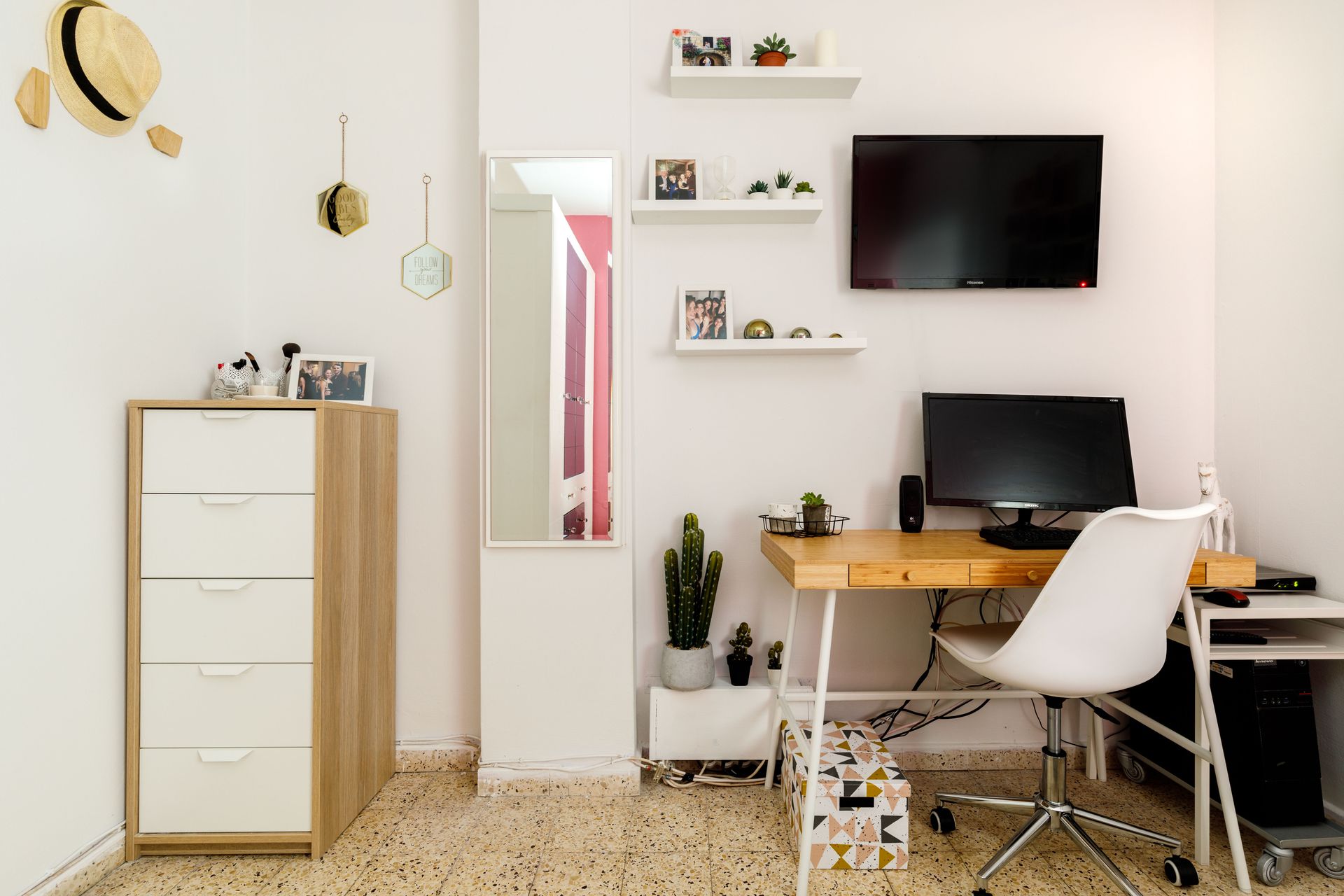 החלפנו את הווילונות והתמונות, הוספנו שידת אחסון, מדפי אקססוריז וווי תליה דקורטיביים, את התאורה התאמנו לגוון יום צהוב והוספנו לו אהיל עכשווי.